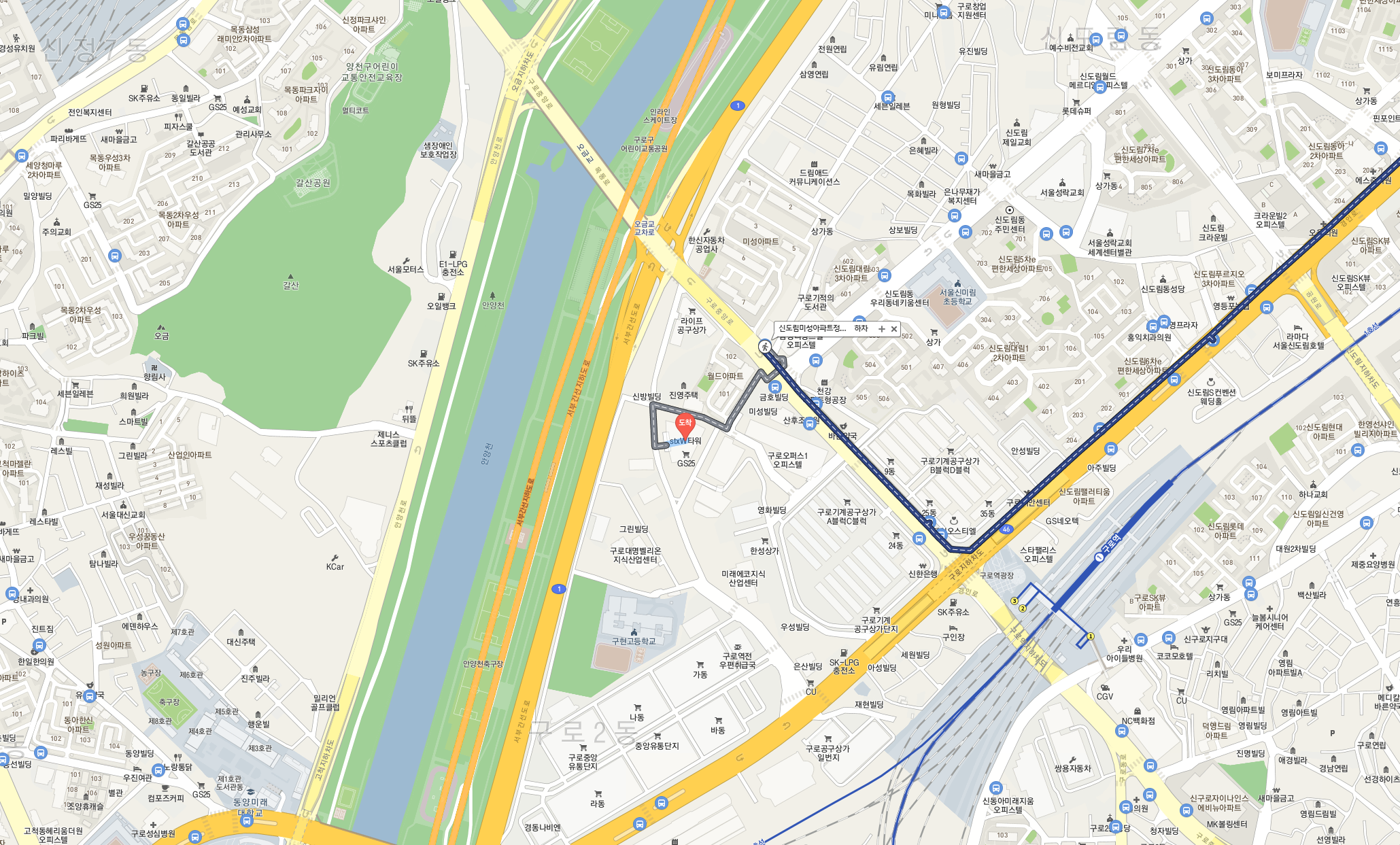 구로역에서는 도보로 약 10~15분 정도 걸리기에 역과 가까운 것은 아닙니다.