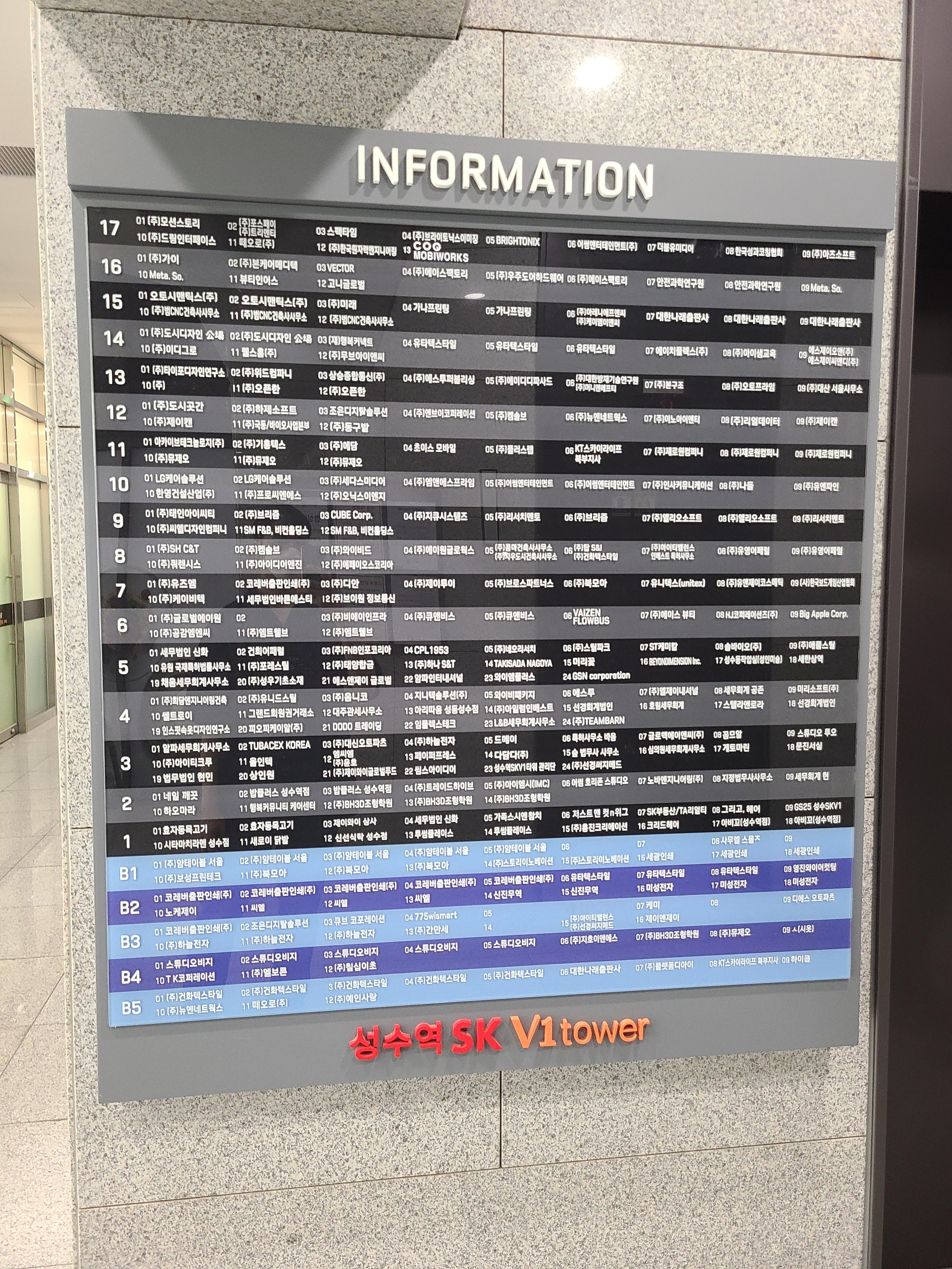 이 곳은 2019년 7월 준공된 곳으로 지하 5층 ~ 지상 12층으로 건축되었습니다. 층별로 입주한 업체들이 넓게 사용하는지 많은 기업들이 있지는 않았습니다.
