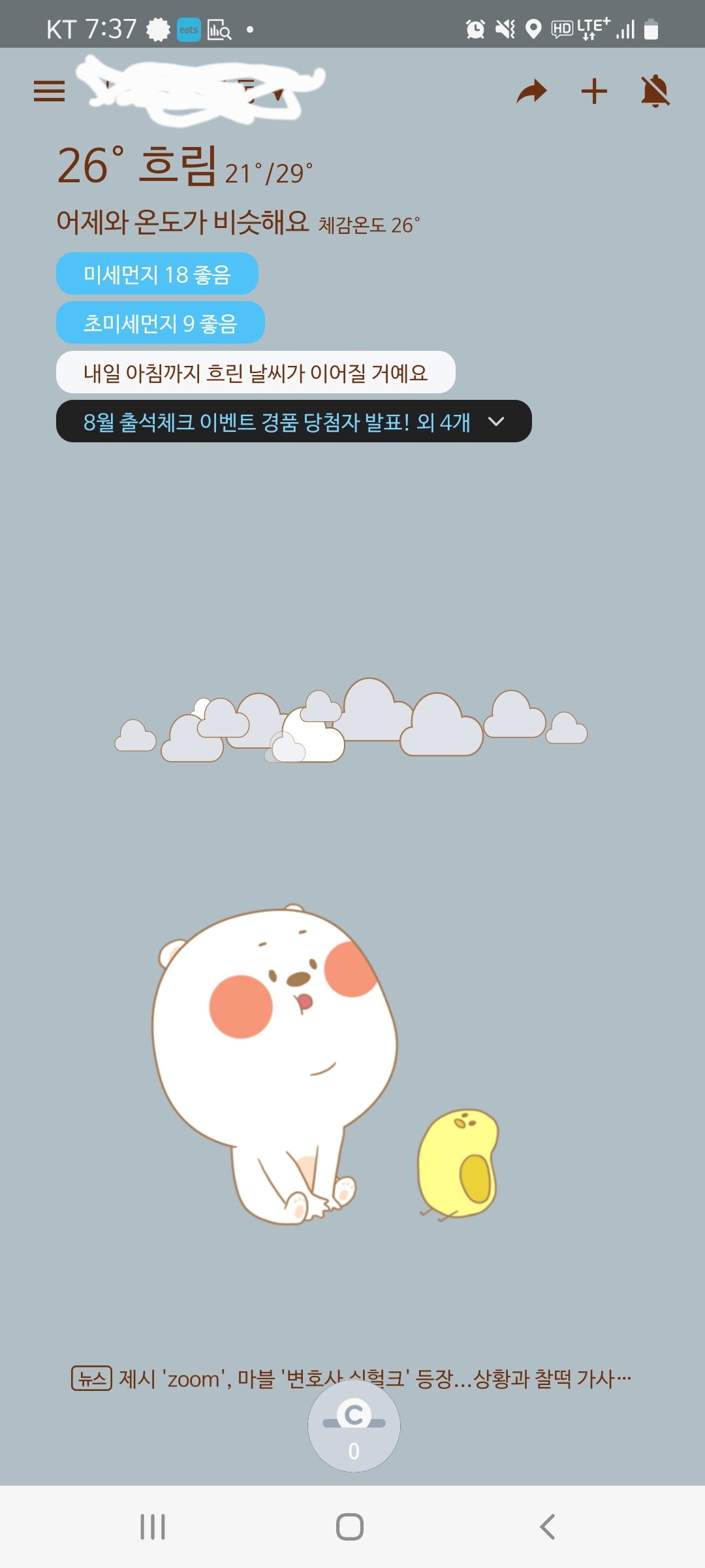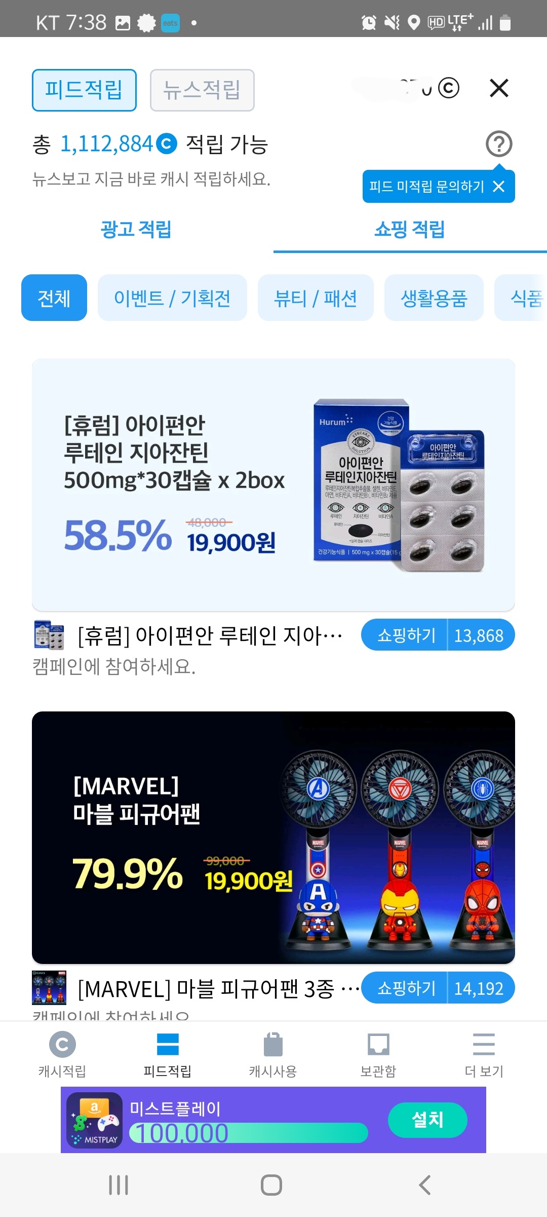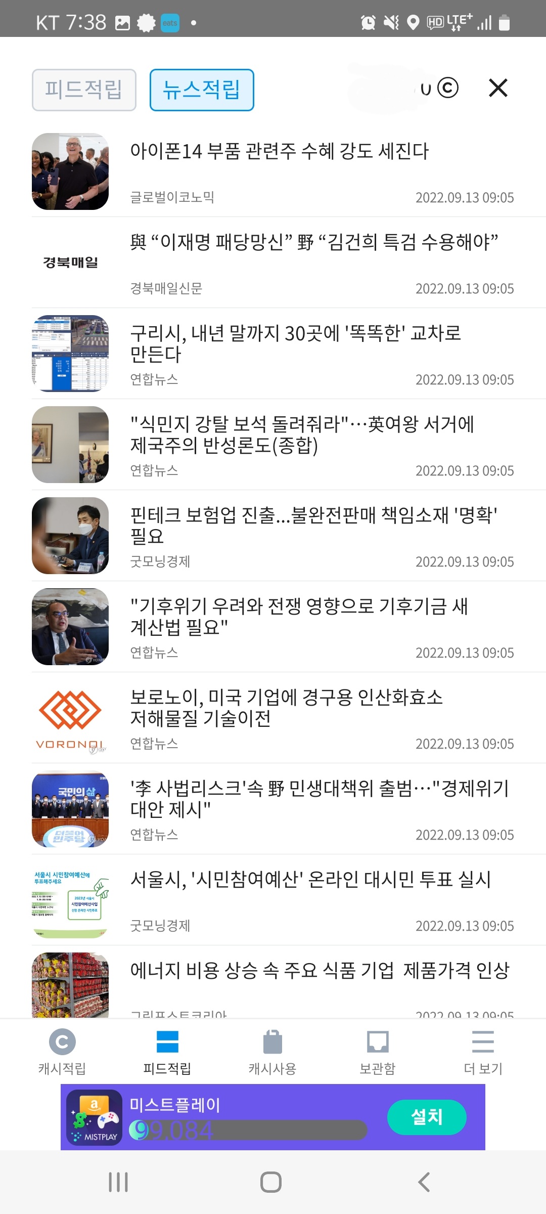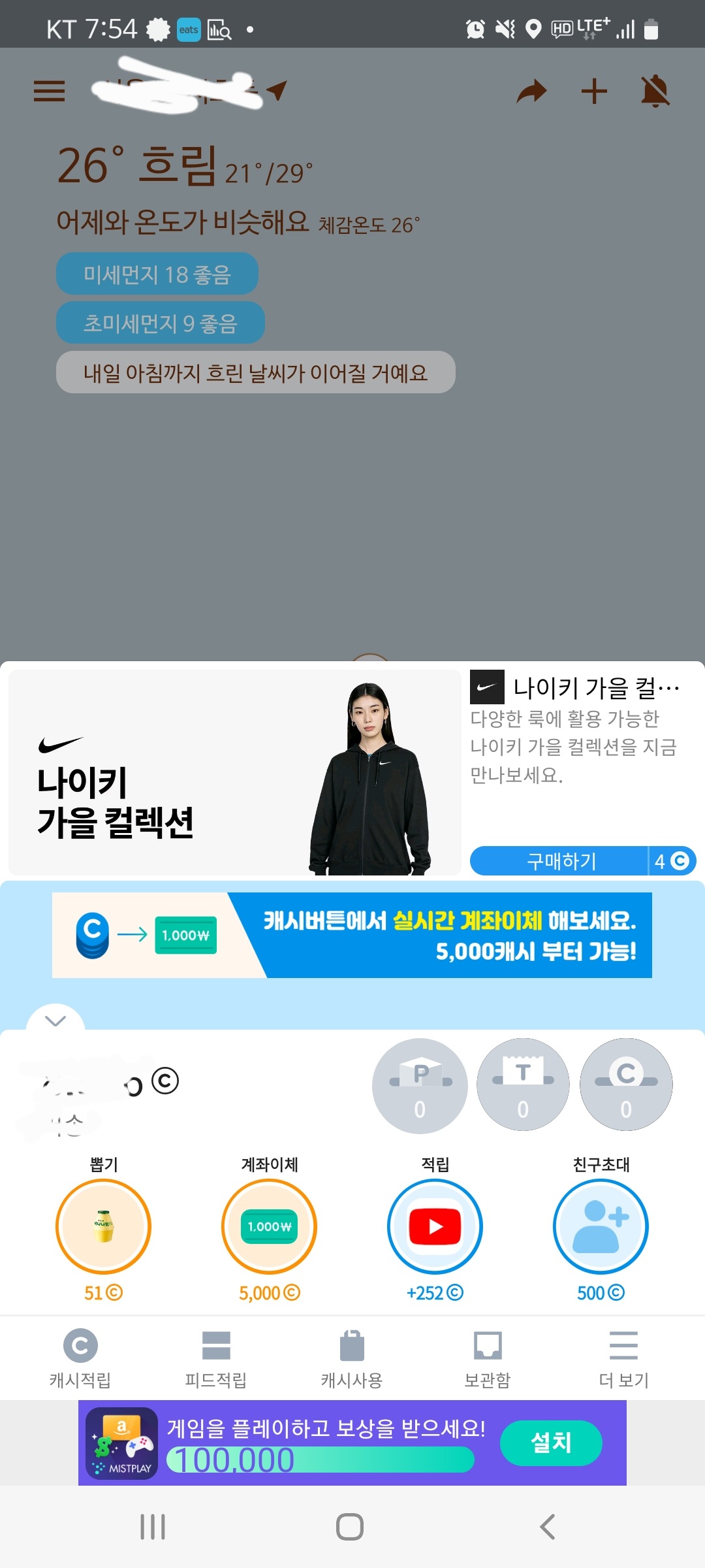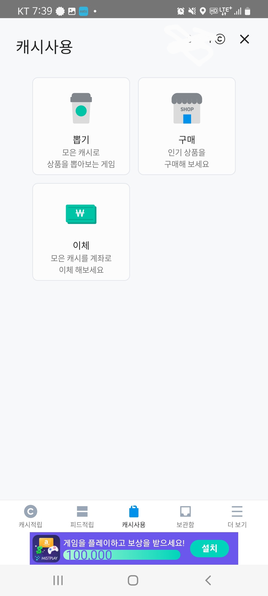 광고 및 뉴스를 보면 캐시를 적립해줍니다