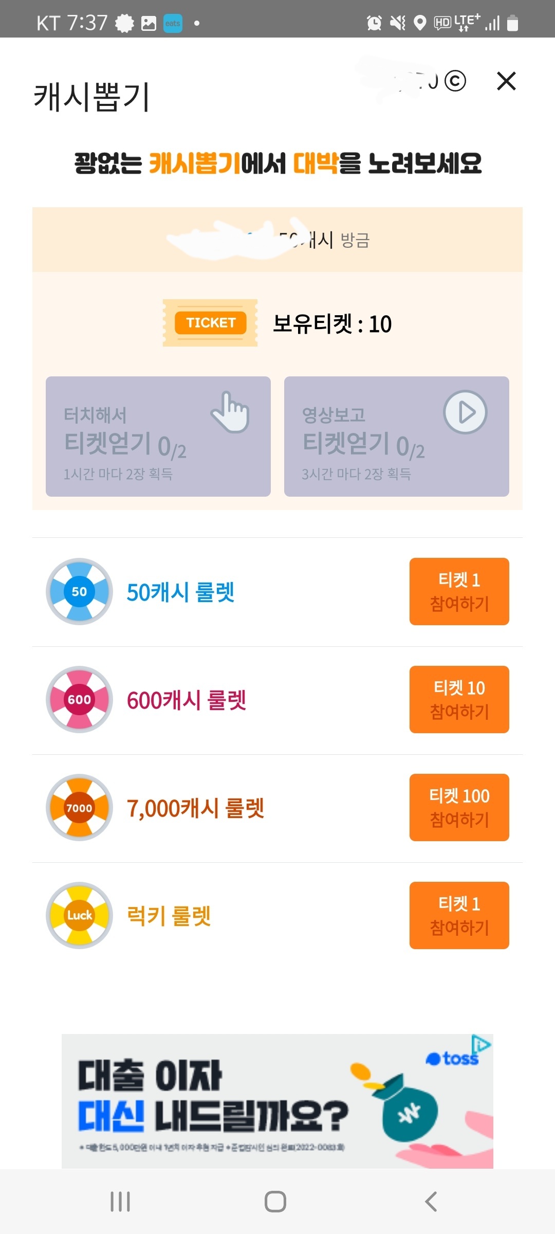 1시간 및 3시간마다 주는 티켓을 모아서 룰렛으로 캐시를 모을 수 있습니다