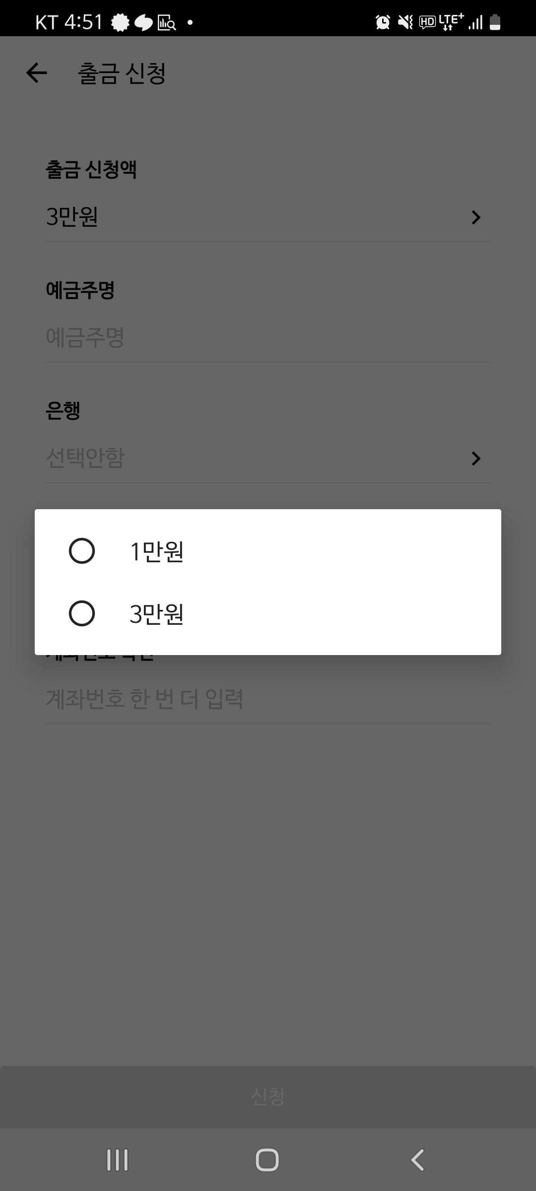 출금 신청은 1만원 또는 3만원을 할 수 있고, 많은 금액을 한번에 출금하려면 방문해야합니다