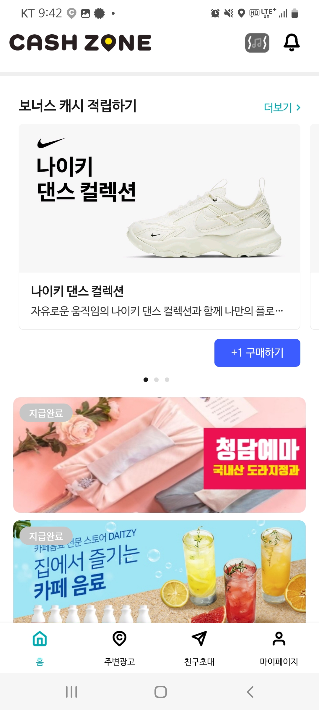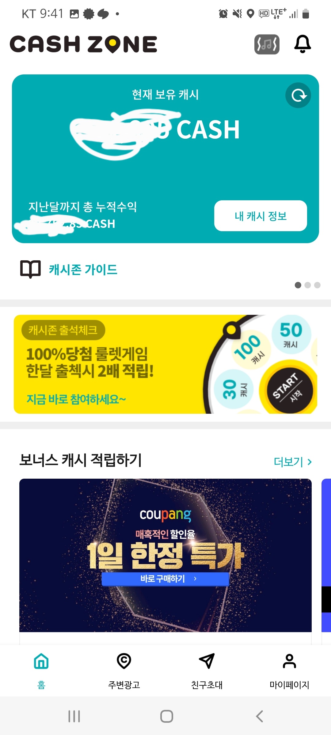 캐시를 얻을 수 있는 방법은 출석체크, 광고시청입니다