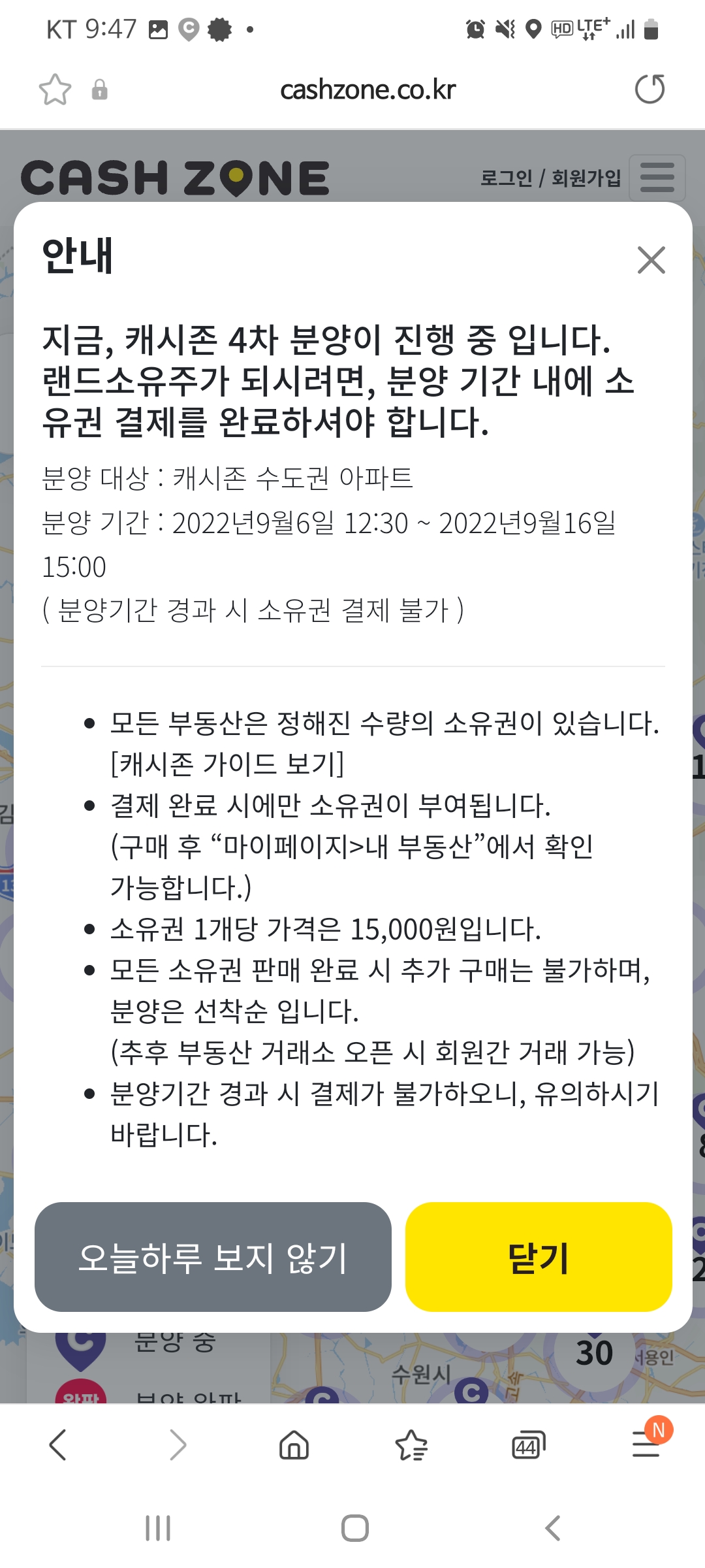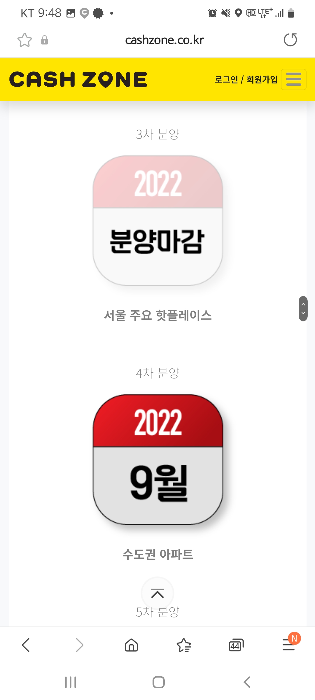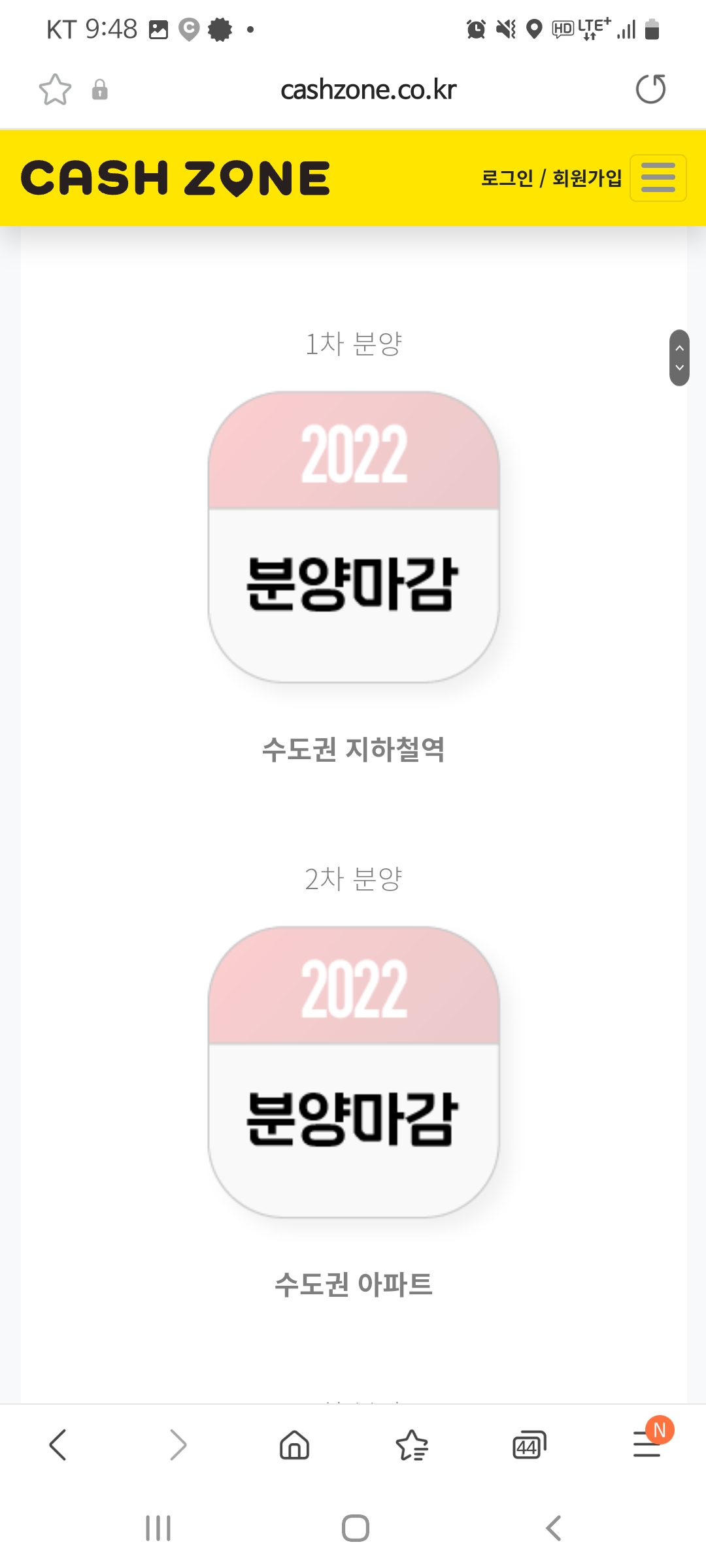 인터넷에서 캐시존 홈페이지를 들어가보면 현재 수도권 지하철, 주요 핫플레이스, 아파트(1차)는 분양 완료되었고 아파트(2차)는 분양 중인 것을 알수 있습니다.