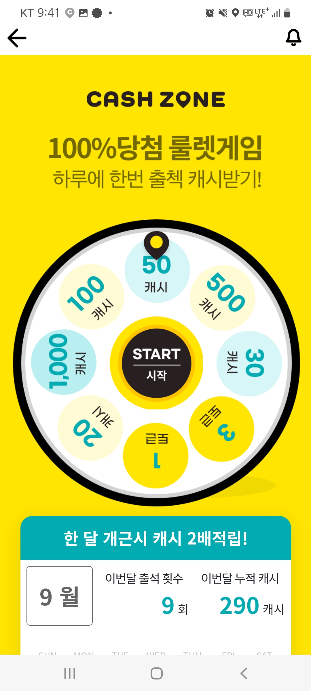 먼저 출석체크를 하면 매일 랜덤으로 캐시 또는 토큰을 얻을 수 있고 한달 모두를 출석하면 한달동안 얻은 포인트를 그대로 추가 적립해줍니다