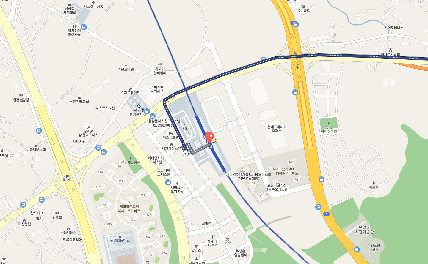 세마역기준 1번출구 방향은 아파트들이 있고 나름 번화가 되고 있는 중인듯했지만 2번출구 방향은 텅텅 비어있는 상태였습니다.(물론 현대프리미어캠퍼스가 지어지고하면 추후에 주변이 더 발전할꺼라 생각합니다)