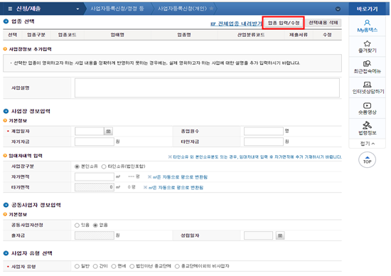 다음으로 업종을 선택해야하는데 업종 입력/수정을 클릭해줍니다.